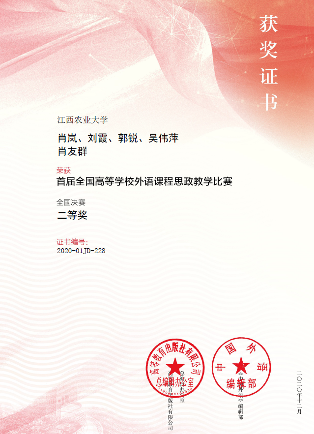 “全国高等学校外语课程思政教学比赛”共吸引来自29个省市、771所高校的1500个教学团队或个人参加,我校青年教师团队凭借过硬的教学能力,顺利进入全国决赛并喜获全国二等奖。